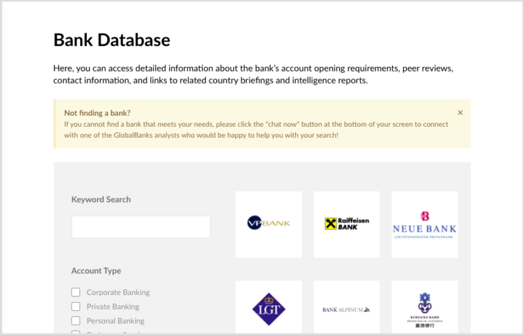 You will also get access to the GlobalBanks Database which includes easy-to-digest bank profiles, analyst insights, account opening contacts, and unique opportunities for the top banks in 50+ countries.